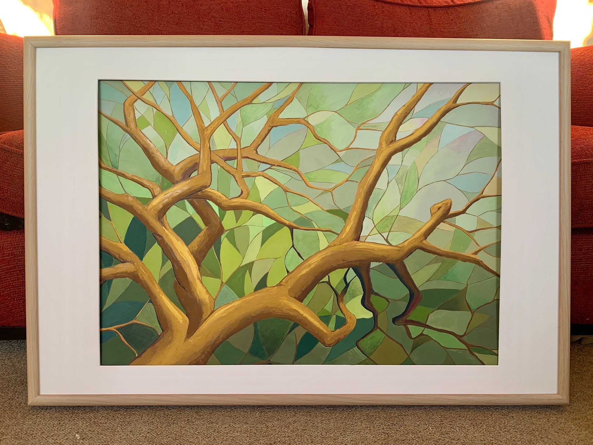 This tree can be found in Sydenham Hill woods - its a really good one for climbing on! The painting is oil over acrylic and is painted in a Mosaic stained glass window style in many shades of green. The painting is on thick greyboard.