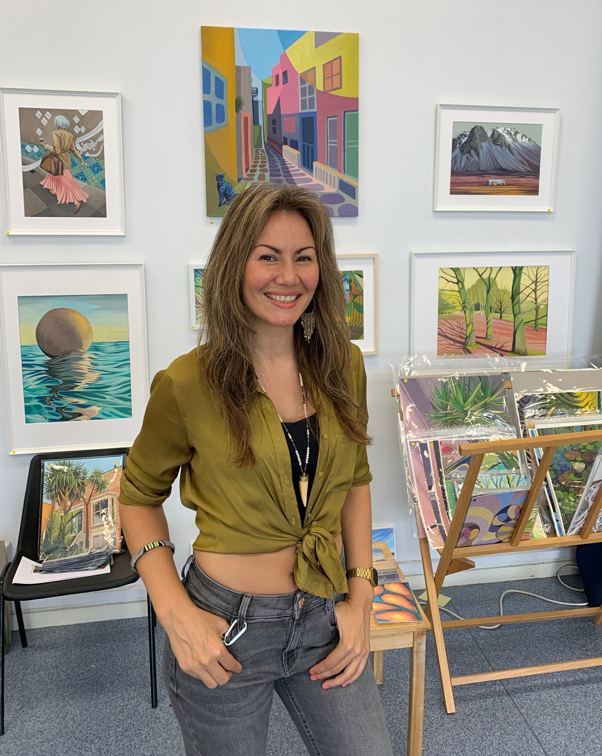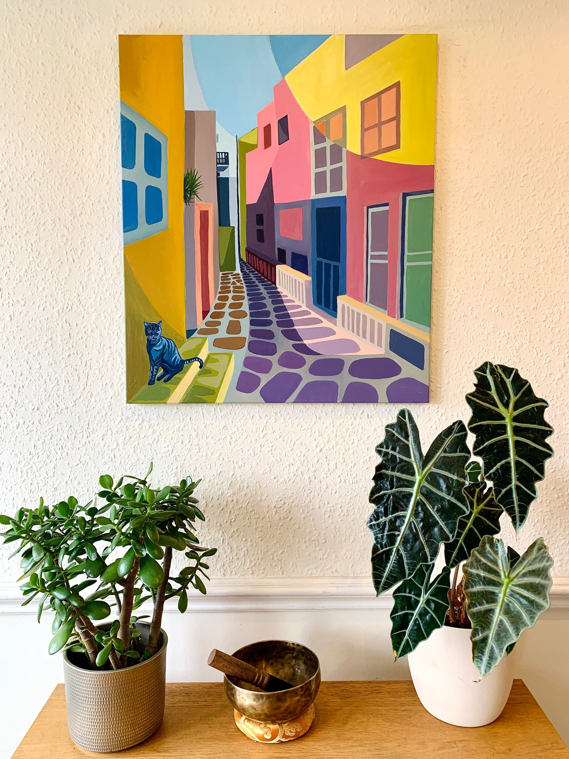 This painting is of a street in old Mykonos Town, in Greece. I loved how simple the streets were and imagined all sorts of colours on the white walls. I decided to add the colours I would have loved to see. the first photo is the final painting (the other photos are missing a couple of details that were added later).
