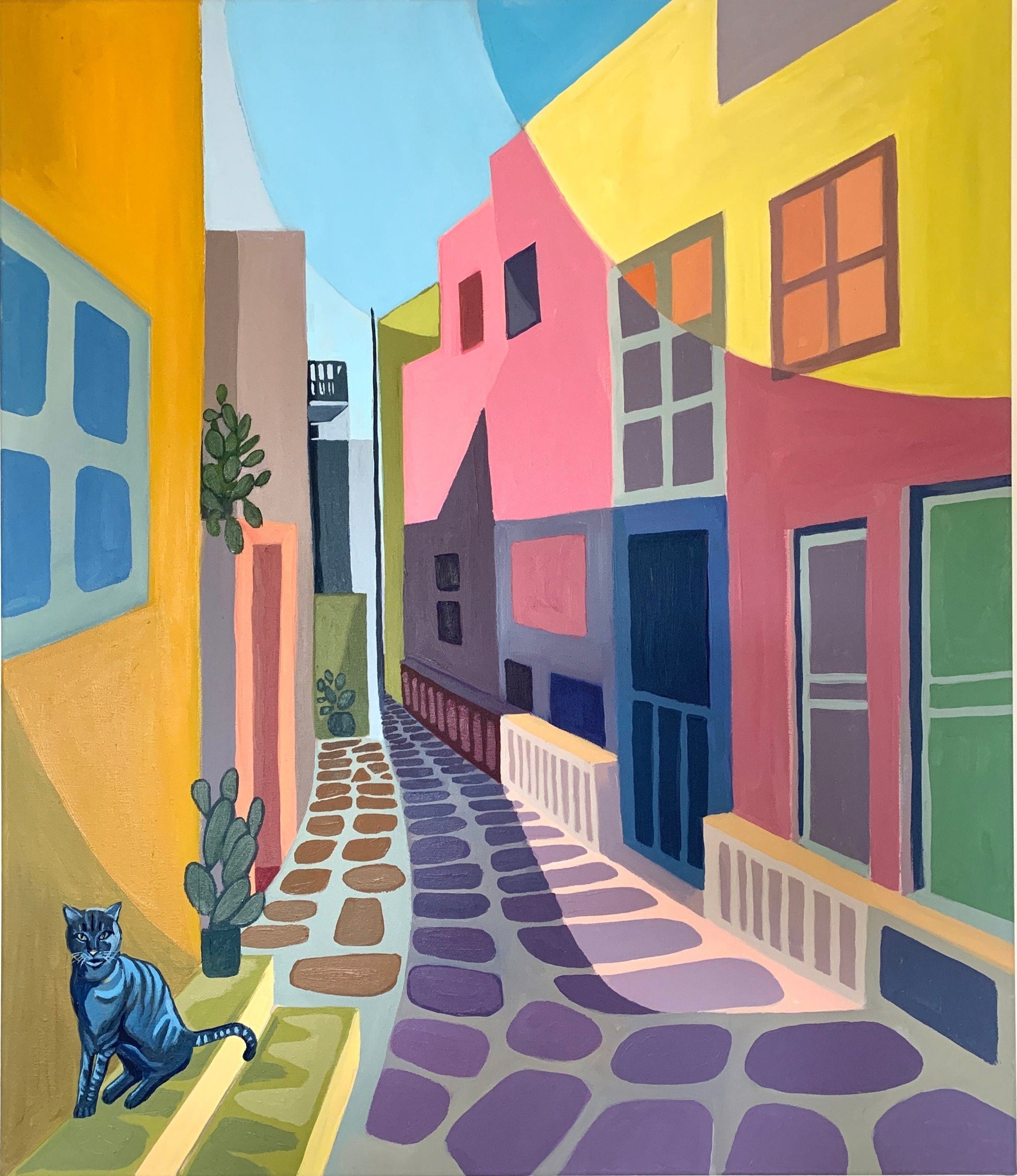 28 x 23 inch - MYKONOS GREECE Colourful Street and cat - Original Oil Painting