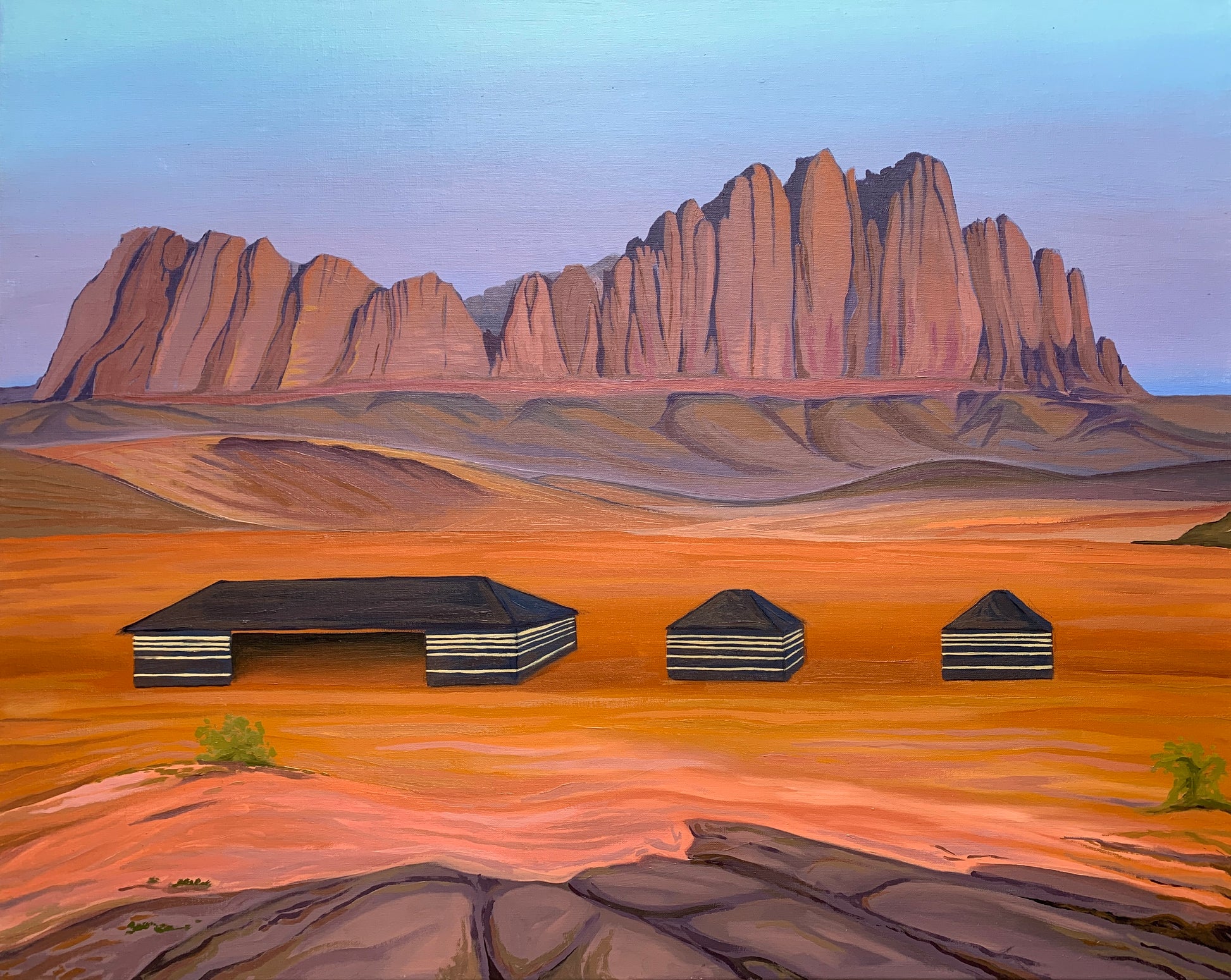 This view was what I woke up to staying at the Mohammad Mutlak Camp in the south protected area of the Wadi Rum desert in the beautiful country of Jordan. This painting will bring uplifting vibrant, warm energy to a room and a sense of peace and serenity. The solid mountain symbolizes strength and masculinity. The two pictures shown are a slightly different tone due to the room/light they were photographed in. If you would like to virtually view the painting on a call, please contact me to arrange.