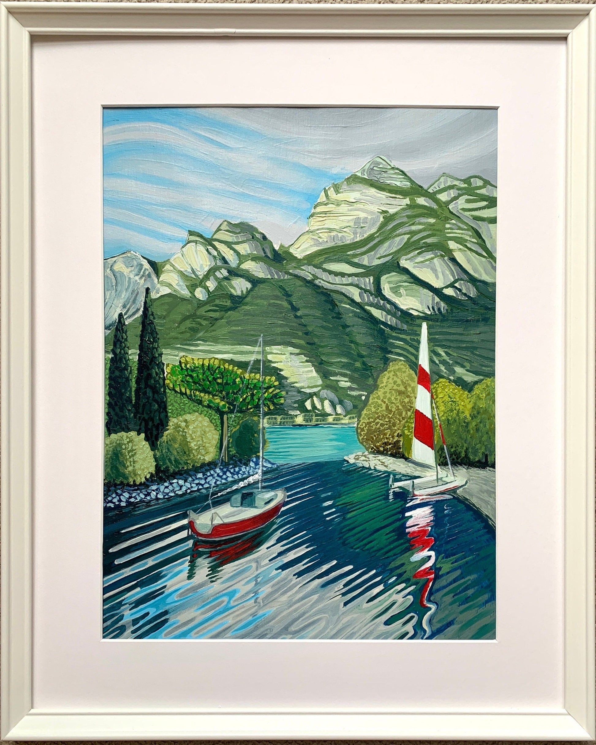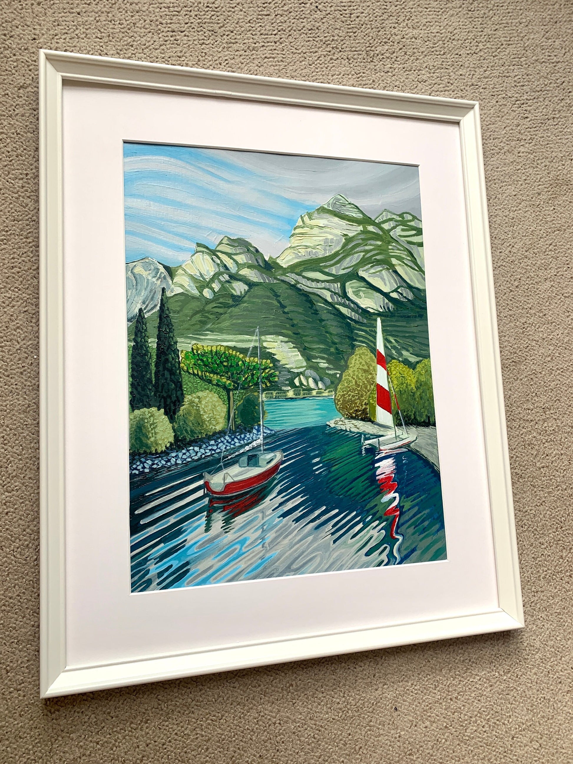 This painting is inspired by the lovely walk along the calm shoreline from the town of Riva del Garda towards the town of Torbole, both at the north end of Lake Garda. I loved the reflections of the boats and the mountains on the surface of the water, it’s such a beautiful place.